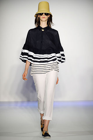 Fronzoli edoardiani, tipici della Belle Époque britannica, cappelli a larghe falde e mises da marinaio si mescolano nei looks della P/E 2010 della stilista neozelandese Karen Walker. Lo stile trae ispirazione dalla nota serie televisiva inglese degli anni ’60, “The Prisoner”, dove un ex-agente segreto del governo britannico viene imprigionato in un piccolo villaggio dallo stile mediterraneo.