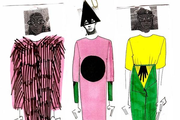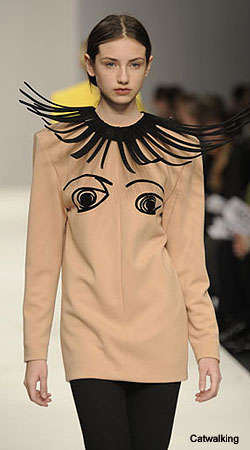 Cappelli a forma di cono, combinazioni di stampe trompe l’oeil, grandi ciglia che ondeggiano sul petto. Sembrano sul punto di animarsi gli abiti cartoon della stilista Laura Mackness, ispirati al lavoro del graphic designer,illustratore e fotografo Jean Paul Goude, agli artisti Erwin Wurm e Christian Marclay e naturalmente a forme geometriche di base come cerchi e triangoli. La palette di colori che va dal verde prato al cipria trae spunto dalla fotografia del tedesco Juergen Teller. Un mix di humor in mood Moschino e di particolari inaspettati in stile Martin Margiela.