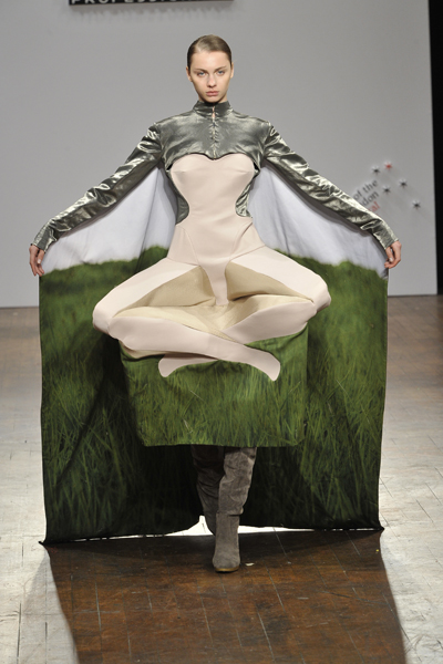 Come i Dadaisti andavano contro le regole dell’arte, certe invenzioni dei più recenti fashion designer se non vanno contro l’arte, di certo non prediligono una moda prettamente indossabile. Sperimentazioni ai limiti del surreale, materializzazioni di visioni che “camminano” su corpi di donna. Moira Cristescu, durante il suo graduate show presso il Central St. Martins College of Art, ha fatto sfilare una modella che, di primo acchito, ha l’aria di volare in comoda posizione Yoga. Un trompe-l’oeil della couture che Moira, appassionata di pittura sin da bambina e affascinata dal corpo umano, ha saputo realizzare superbamente. La parte superiore dell’abito-composizione e gli stivali in grigio, contro i colori naturali di un prato e un cielo illusionistici e il bianco del corpo seduto, sembrano richiamare il contrasto tra una realtà artificiale e il desiderio di una pace interiore.