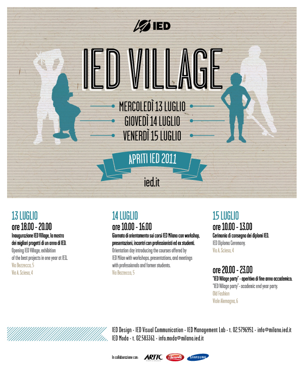 IED, istituto fondato nel 1966 “sull’idea che il sapere e il saper fare devono crescere insieme”, come dice il fondatore e Presidente Francesco Morelli, ha organizzato l’appuntamento APRITI IED dal 13 al 15 luglio: tre giornate di porte aperte dove, oltre a poter ammirare i migliori progetti di tesi realizzati nell’anno accademico 2010-2011 allestiti nell’ambito della mostra di IED Village, i docenti e lo staff della scuola sono stati a disposizione per informare e guidare i futuri studenti ad una scelta consapevole e mirata del proprio percorso di studio e formazione.
