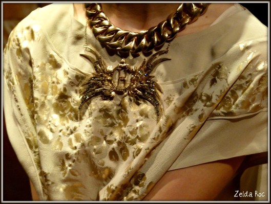 Il barocco è rivisto in chiave street e chic: catene, ciondoli a forma di ali d’aquila, triple collane, strass insieme a bottoni, ricami, gioielli tra i capelli e sul cappello sono il segno di un nuovo Barock’n Roll.