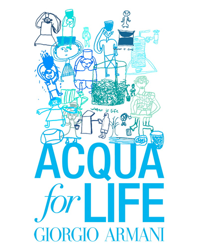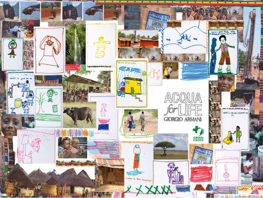 A Zelda piace: Lo scorso giugno Giorgio Armani ha ricevuto una busta dal Ghana. Dentro c’erano dozzine di disegni fatti dai bambini delle comunità aiutate grazie ad “Acqua for Life”. Il loro modo di dire “grazie” mostrava immagini di vita quotidiana, donne che raccolgono l’acqua dai pozzi appena costruiti, oppure scene di scuola. Giorgio Armani ha reso omaggio a questo prezioso dono attraverso una serie di t-shirt che riportano questi disegni. Queste t-shirt sono in vendita in alcuni selezionati negozi Emporio Armani ed il 30% del prezzo di vendita sarà destinato a Gren Cross International a favore del programma ‘Smart Water for Green Schools’.